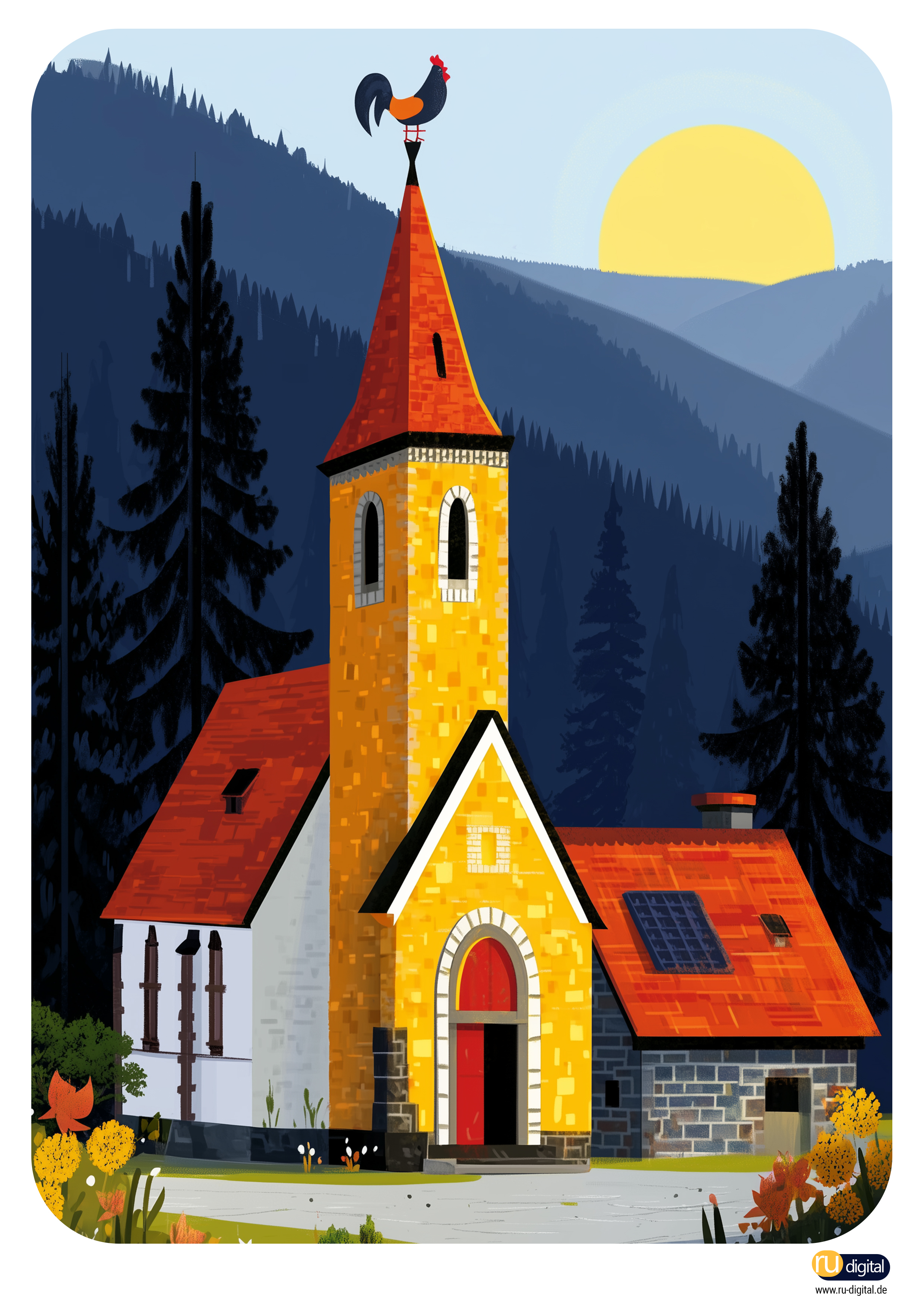 Diese Illustration zeigt eine kleine, einladende Kirche mit rotem Dach und goldenem Turm im Morgenlicht. Die Kirche steht inmitten einer friedlichen Landschaft – umgeben von Wäldern und Bergen – und symbolisiert Geborgenheit, Gemeinschaft und Glauben. Sie ist ein Ort, an dem Menschen zusammenkommen, um zu beten, zu feiern, zu trauern und Gottes Nähe zu spüren. Der Kirchturm mit Hahn weist in den Himmel und erinnert daran, dass der Glaube Orientierung gibt.