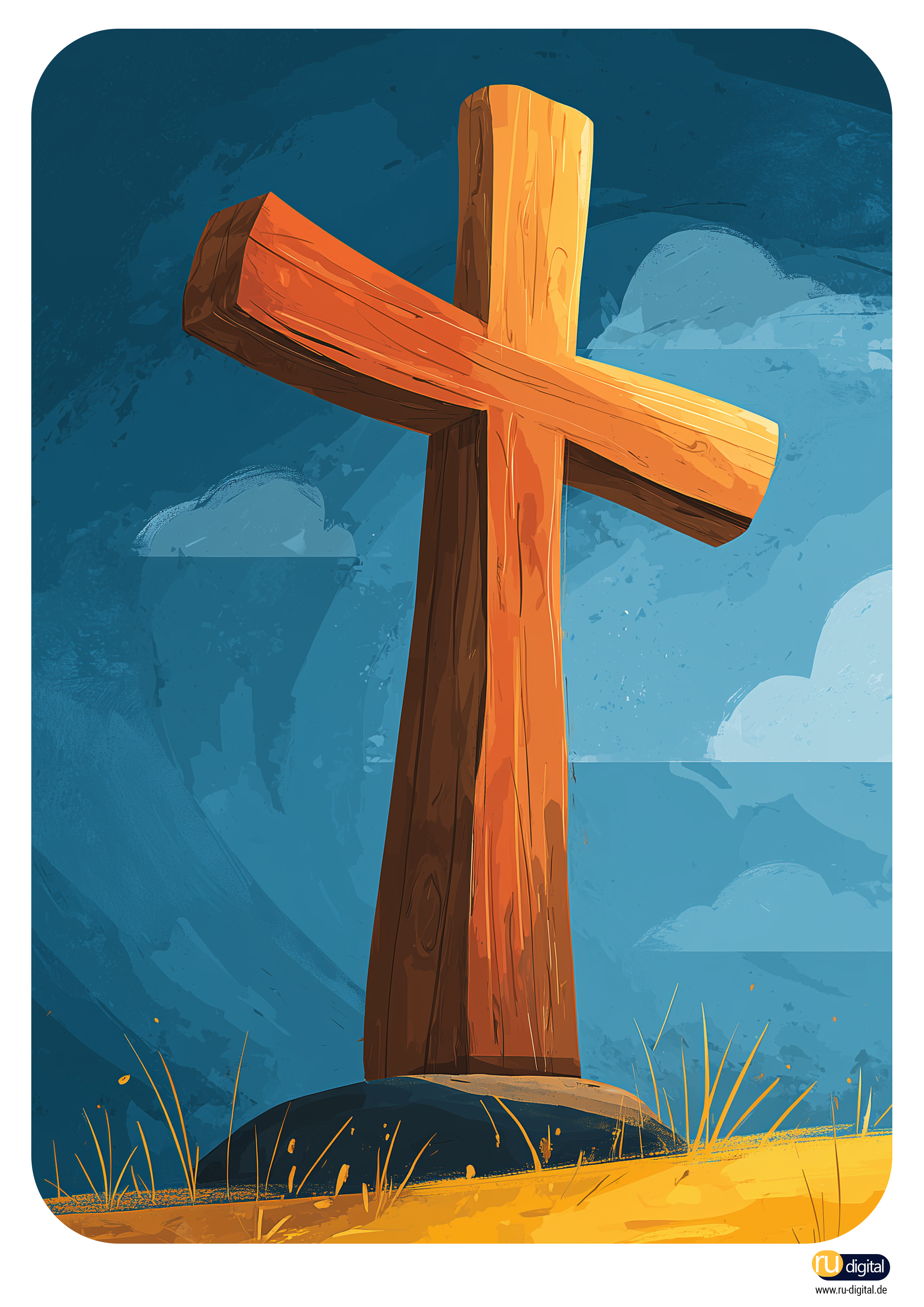 Diese Illustration zeigt ein schlichtes Holzkreuz vor blauem Himmel – fest im Boden verankert und hell vom Sonnenlicht bestrahlt. Das Kreuz ist das zentrale Symbol des Christentums. Es erinnert an den Tod und die Auferstehung Jesu Christi und steht für Leben, Hoffnung und Liebe, die stärker sind als der Tod. Es ist Zeichen des Glaubens, des Vertrauens in Gott und der Verbindung zwischen Himmel und Erde.