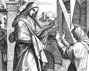 M 5 – Bild: Maria und Elisabeth (Julius Schnorr von Carolsfeld). Ein Kunstwerk, das die Begegnung der beiden Frauen zeigt. Das Bild unterstützt die Interpretation der Szene „Mariä Heimsuchung“ und verweist auf Freude und gegenseitige Bestärkung im Glauben.
